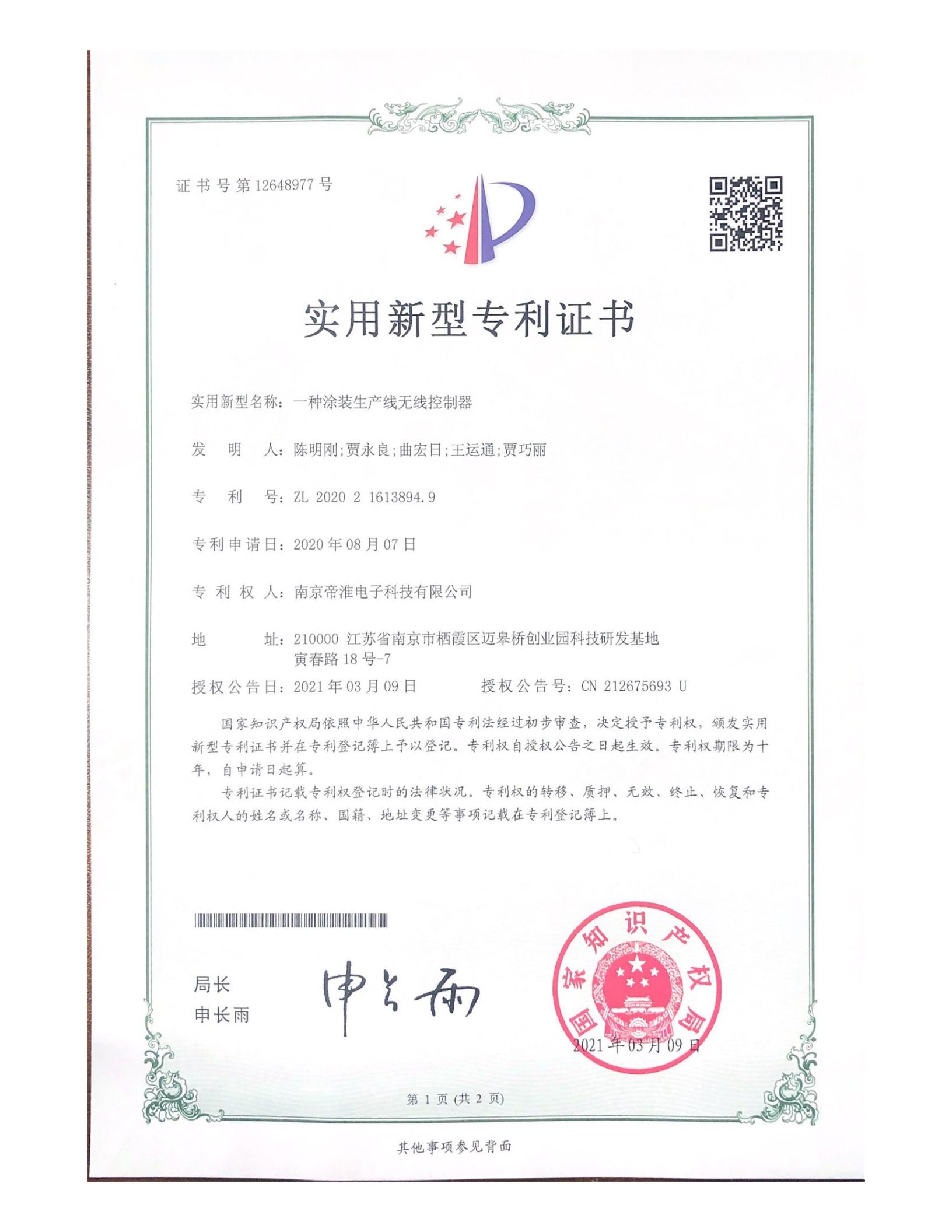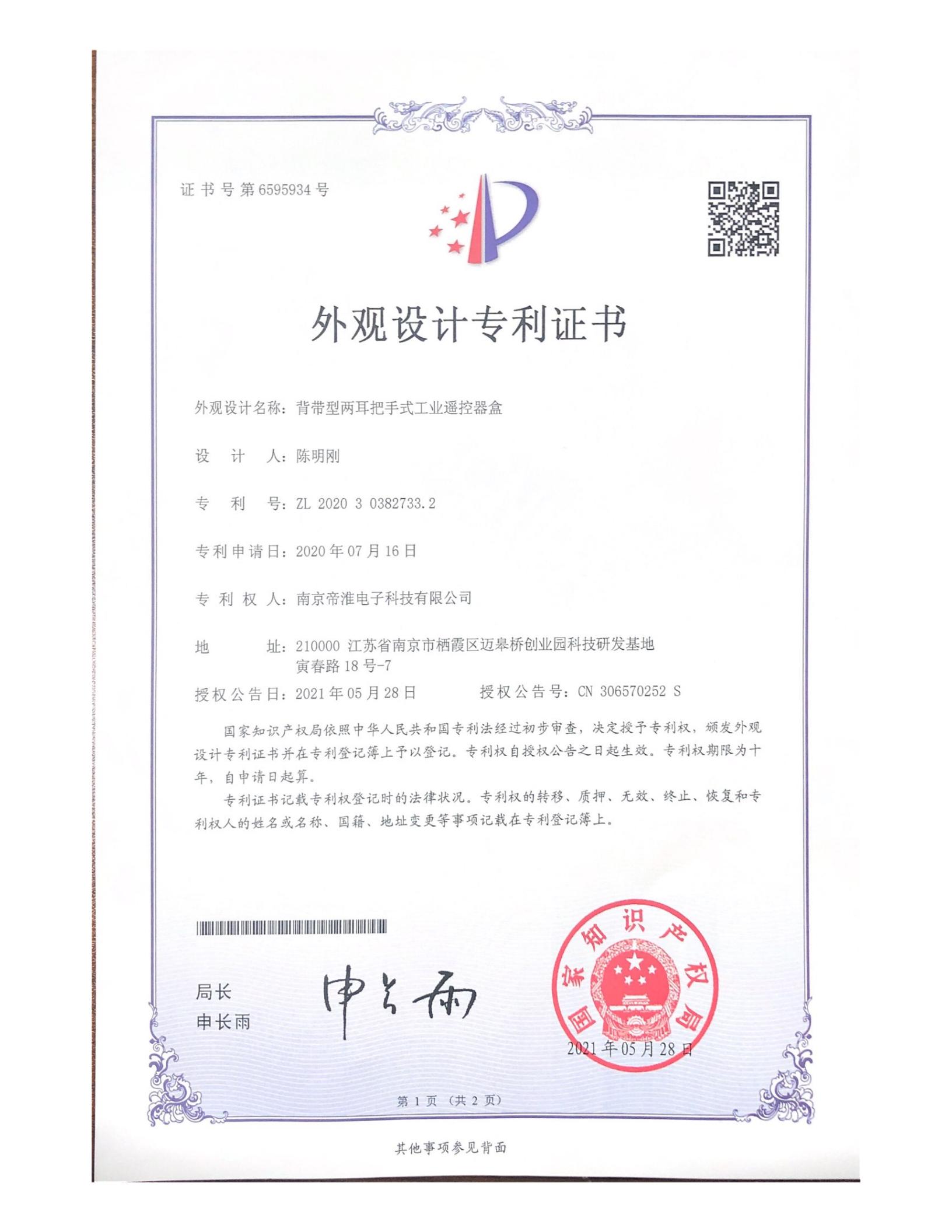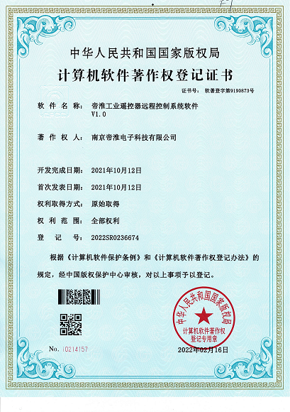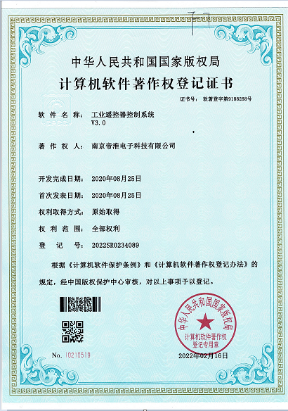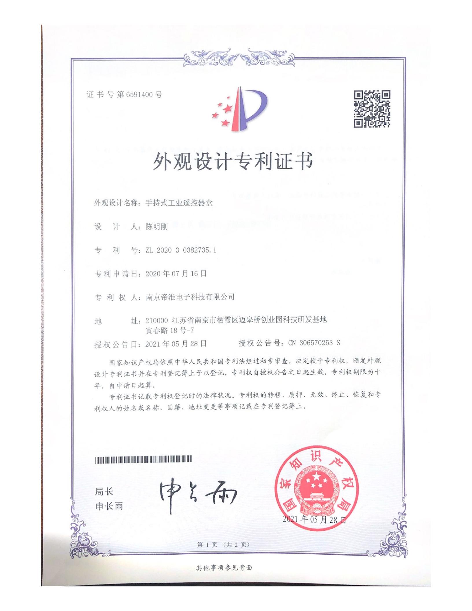 南京帝淮电子科技有限公司,国内工业??仄餍幸盗炀笠担灾餮蟹?、定制、非标设计各类工业级无线遥控器、工业级有线控制器、智能化自主算法逻辑的本地控制器等系列产品。已经申请及正在申请的技术专利、外观专利有近三十项左右,并通过了CE欧盟认证、国家级试验检验报告、EMC电磁兼容认证等。